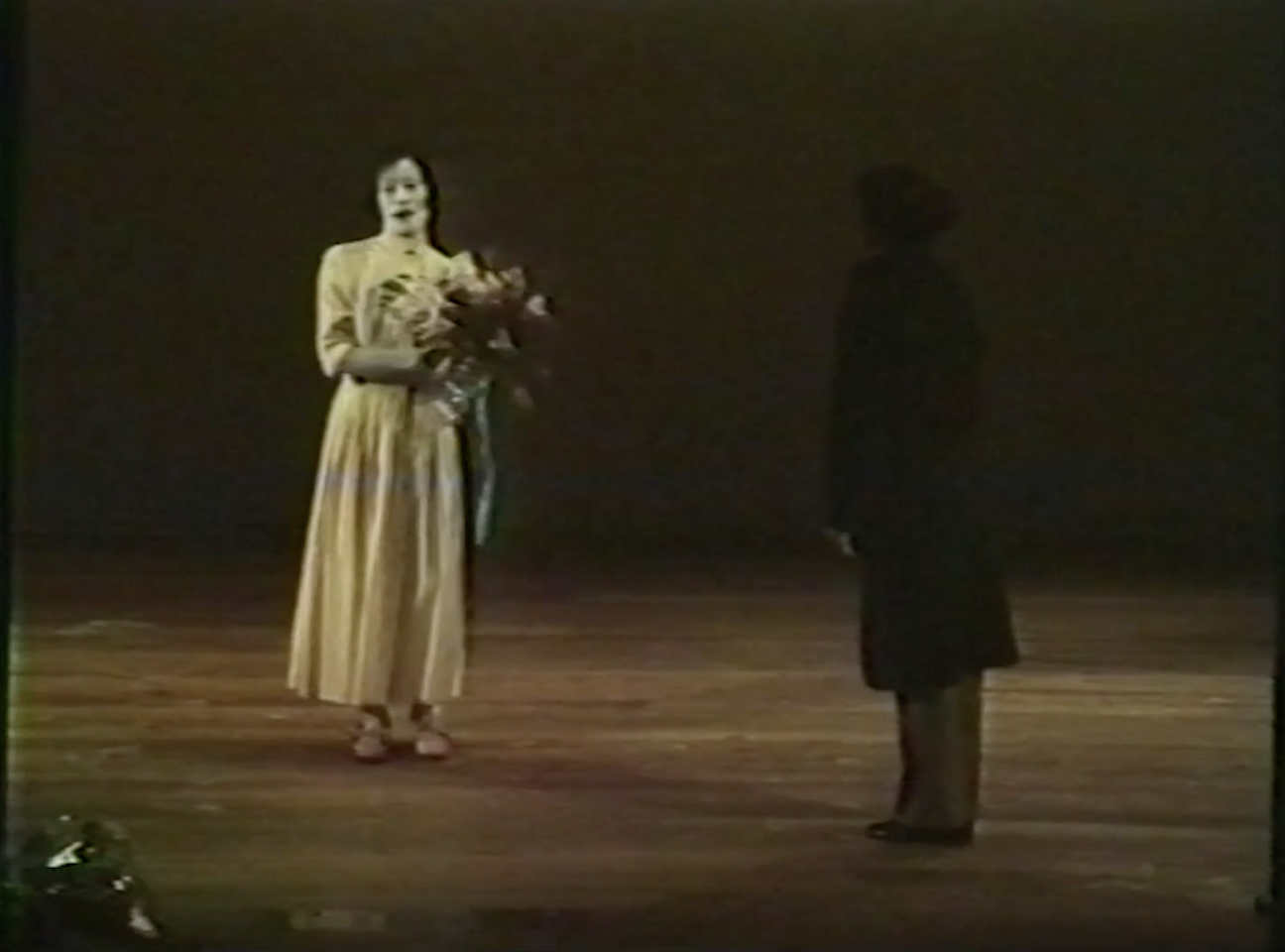 The curtain call is an unforgettable moment in which the final moments of a performance intermingle with the performer returning from fiction to reality. In this curtain call from the premiere of Admiring La Argentina in 1977, the director Tatsumi Hijikata himself appears onstage and presents a bouquet to Ohno.