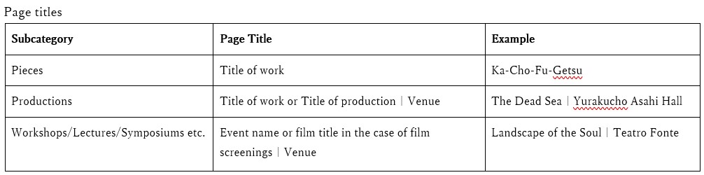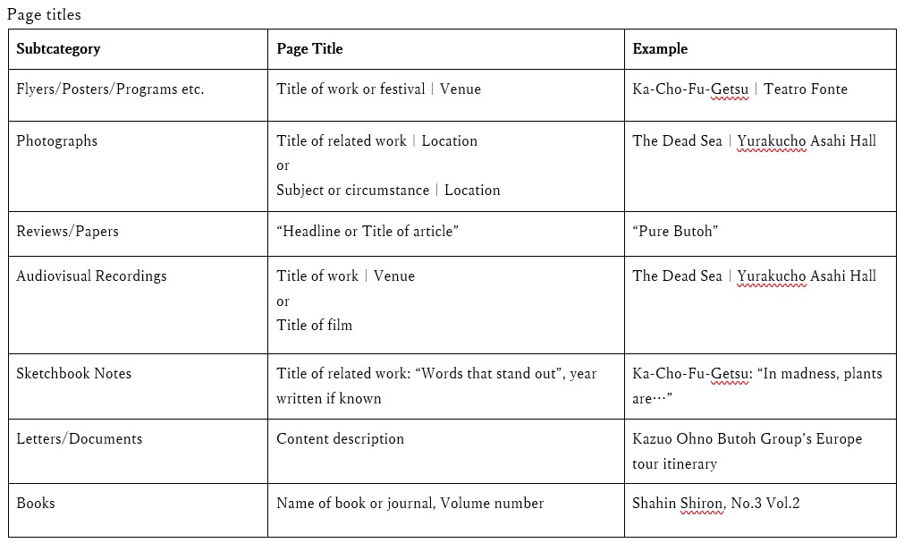 “Productions” category include all recorded performances, not only those performed in theatres, but also spontaneous improvisations by Kazuo Ohno and Yoshito Ohno, performances that took place outside of a traditional theatre venue, and short performances that only lasted a single song.