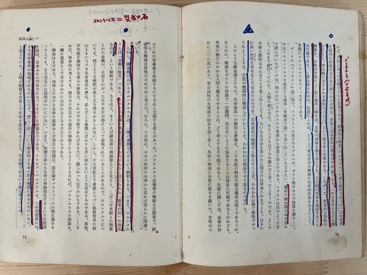 本文冒頭から青、赤、黒の線引きや重要箇所に記したと思われる◎△などの記号が見受けられるが、最初に大野が取り上げたイメージは「玩具について」の章に登場する「ホムンクルス」である。澁澤の本文から読解可能なホムンクルスとは、「生命造出の可能性、無機物から有機物を導き出す可能性」(澁澤、p. 12、以下引用は同箇所より)であり、この「新たな一個の矮人(ホムンクルス)を造り出そうとする熱望」は「中世錬金道士」のふくれあがった夢である。この章を通じて、自動人形や動く彫像について語られていることもあり、無機物に生命を宿すこと、その根源的な変化の可能性について、大野は惹かれているように思われる。次に書かれた大野のメモはp. 21の「鎧づくりの職人の言葉(生きもの)」で、オートマティックに動く像が、人間に反逆する最古の例を説明した箇所である。また澁澤がゴーレムに言及した箇所にも同じように線が引かれている。これらの事例からは、生命がないものが動き出すこと、そもそも生命を得るとは、有機物とは何かという、動きの根源へと迫ろうとする大野の態度が浮かび上がってくる。ホムンクルスへの関心は、後のページにも再び現れ、p. 75に「ホムンクルス=賢者の石」、p. 76には「(人間の生命に責任を持つことに)殺人罪の構成」というメモが残されている。この後者は、澁澤がボローニャの医者で試験管での胎児の発育に成功したというダニエロ・ペトルッチに言及した箇所であり、ペトルッチは、自分のやっていることが恐ろしくなり、みずからこの胎児を破壊したという文章と呼応している。何かを生み出すことの責任と、胎児殺しの罪というキリスト教的教義が大野の中で交わるようにも思われる。