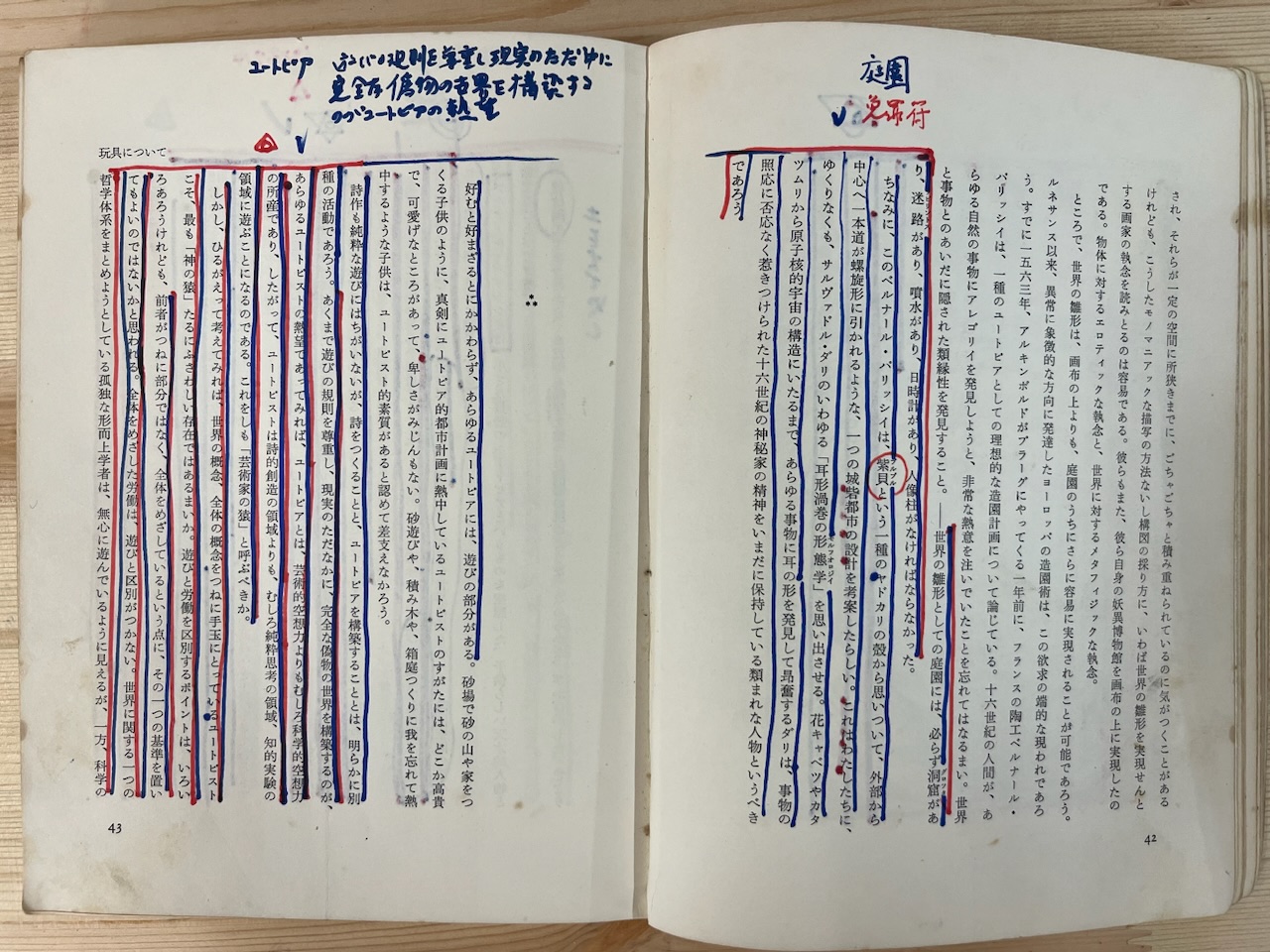 その後、本章ではp. 37にルドルフ二世の生没年のメモ、p. 38に「失われた庭園を求めて」とルドルフ二世への言及が続く。ここではアルキンボルトの野菜、果物、花を組み合わせて描かれたルドルフ二世の肖像画が「庭師」というタイトルで知られていたと澁澤は書き、大野は庭師という言葉に丸をつけている。この庭のイメージは、続くp. 42に書かれたコメント「庭園 免罪符」へとつながっていく。本文では、「世界の雛形」として、迷路や噴水、そして必ず洞窟を備えた庭園が紹介される。大野の舞踏にとって庭いじりは非常に重要な稽古であったが、それはいわゆる「ガーデニング」ではなく、ここで述べられているような世界の雛形の創造、あるいはもうここにはない失われた庭園の再創造という意味合いを持っていたのかもしれない。それは一種のユートピアへと結びつき、澁澤の言葉を引用しつつ、大野はp. 43の余白に「遊びの規則を尊重し現実のただ中に 完全な偽物の世界を構築するのがユートピアの熱望」とコメントを残している。