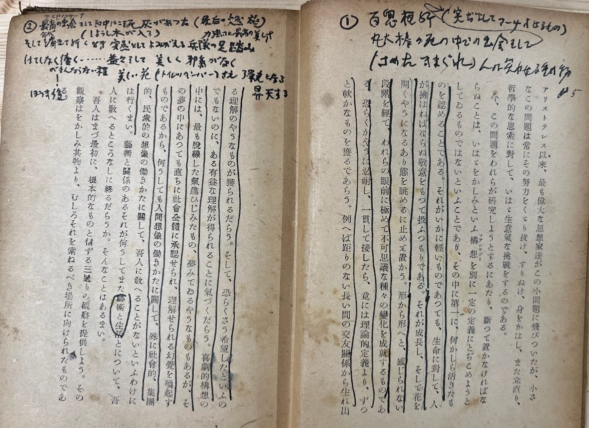 大野の蔵書は現在、横浜にある大野一雄舞踏研究所内の書庫に主として保管されている(注1) 。大野一雄、そして息子であり同じく舞踏家の大野慶人のこの稽古場には、両脇に白い扉のついた収納スペースが設けられている。さらに近年、テレビ台が置かれていた後方の壁にも同じく書庫(それも2重の棚)があったことが判明し、蔵書の全容がほぼ明らかになった。これらを書籍名、著者名、出版社といった書籍情報、および大野の書き込みの有無に分けてリスト化した結果、その総数は書き込みのあるものだけで500冊を超えた(注2) 。最も古いものは、1905年出版の『テニソンの詩』(文學同士會)で、1926年出版の『ポオ評傳』(第一書房)がこれに続く。ただし、『テニソンの詩』には本文中には線引きや書き込みはなく、別に翻訳された詩の一部が1枚紙で挟み込まれているだけである(この挟み込みは、後年のものであろう)。『ポオ評傳』にはマジックおよび鉛筆での線引きと書き込みが見られるが、大野がいつそれを行ったのか、判別することは非常に難しい。マジックの使用は年代が下ったものだと想定されるが、蔵書の出版年 (注3)や入手時期と大野が読んで書き込みをした時期は必ずしも一致しない。時期を特定するのは困難であり、大野がその書籍を読んだのは、基本的には「出版された年よりもあと」としか言いようがない。たとえば1946年出版のベルグソン『笑の哲學』(廣瀬哲士訳、東京堂)にはマジックで書き込みがあるが、「アルゼンチーナ」(おそらくアルヘンチーナを指す)、「馬とほうき」(ほうきは後年のパフォーマンスで登場するモチーフである)という言葉が書かれていることから想像すると、書き込みをしたのは1946年ではなく、かなり後になってからであろう。