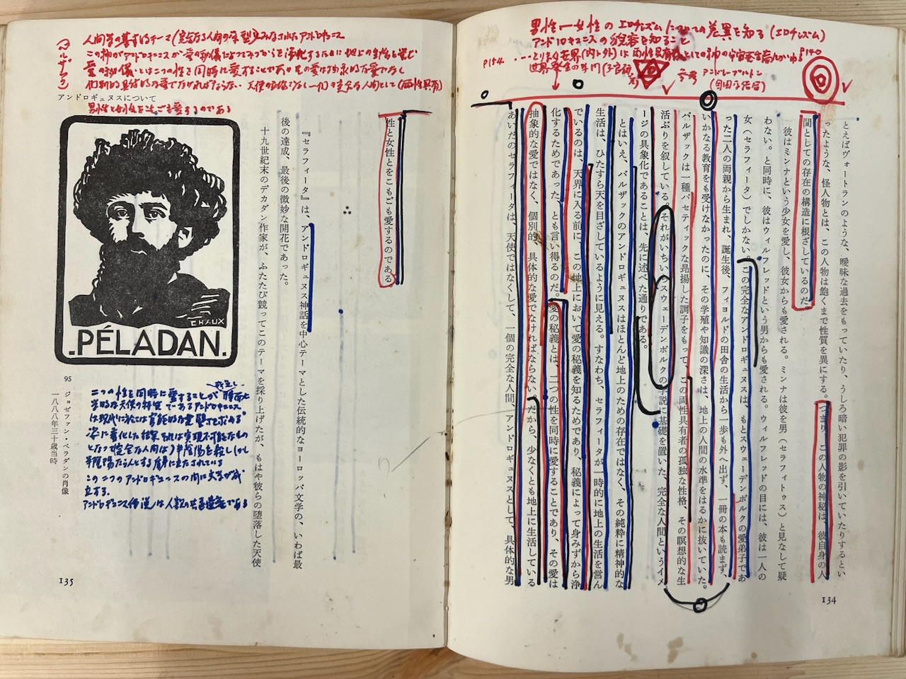 続いて大野の書き込みが熱心に見られるのは、p.133から始まる「アンドロギュヌスについて」の章であり、ここで大野は澁澤を経由してバルザックの『セラフィータ』や、スウェーデンボルクの考え方に触れている。最も多くの書き込みが見られるのは、pp. 134-5の2ページである。両性具有のモチーフは、宇野邦一の『ジュネの奇蹟』(日本文芸社、1994)を多分に引用した創作ノートの中にも見られるが、澁澤の本書からも相当なインスピレーションを得ていることがわかる。